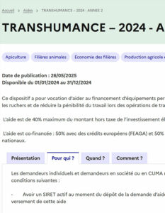 Ce dispositif a pour vocation d’aider au financement d’équipements permettant de moderniser les ruchers et de réduire la pénibilité du travail lors des opérations de transhumance.
